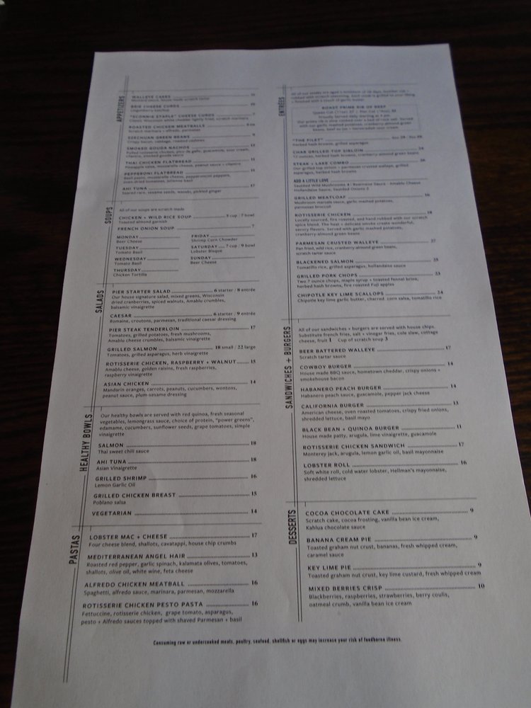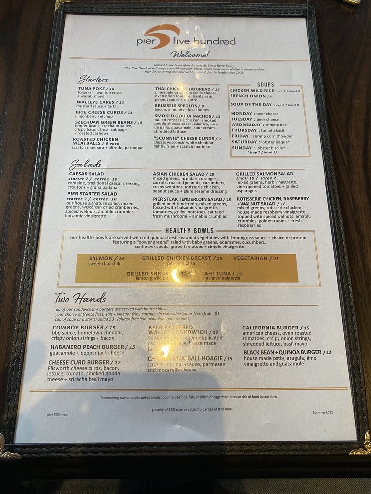 Introducing the menu at Pier 500, a classy yet casual American restaurant in Hudson, WI, offers a delightful dining experience with a focus on breakfast & brunch. The venue boasts a spacious outdoor deck providing stunning views of the river, making it perfect for gatherings with friends. With options ranging from chicken wild rice soup and smoked chicken to fresh ceviche, Pier 500 promises a diverse and flavorful menu. Customers rave about the ambiance, friendly service, and delicious cocktails. From the Fish & Chips to the Sprecher root beer, every dish at Pier 500 is described as outstanding and tasty. Whether you're enjoying a meal on the patio or inside by the elegant interior, Pier 500 ensures a memorable dining experience for all.